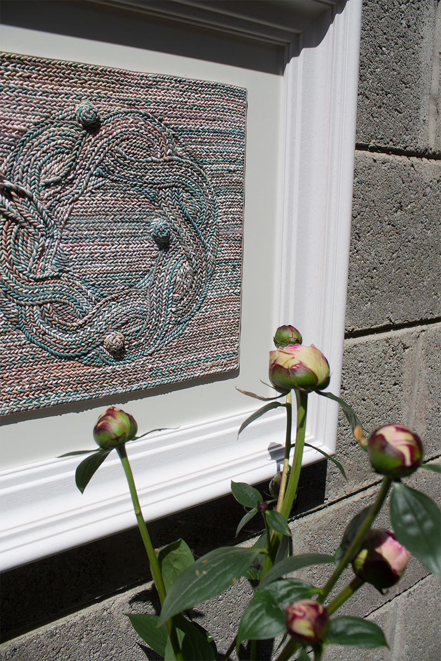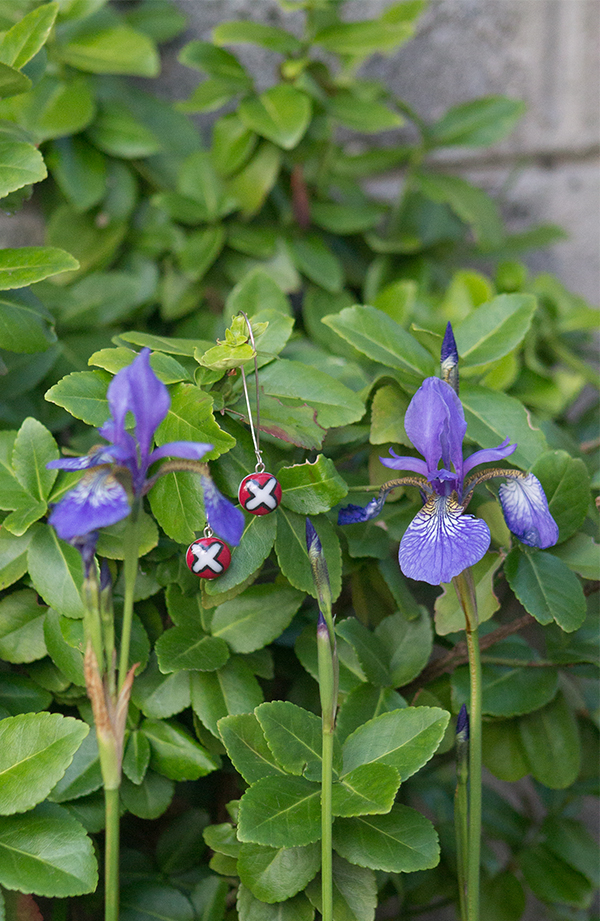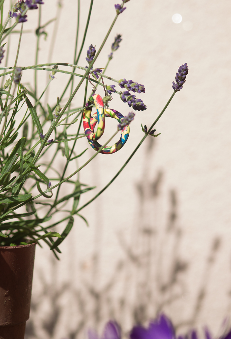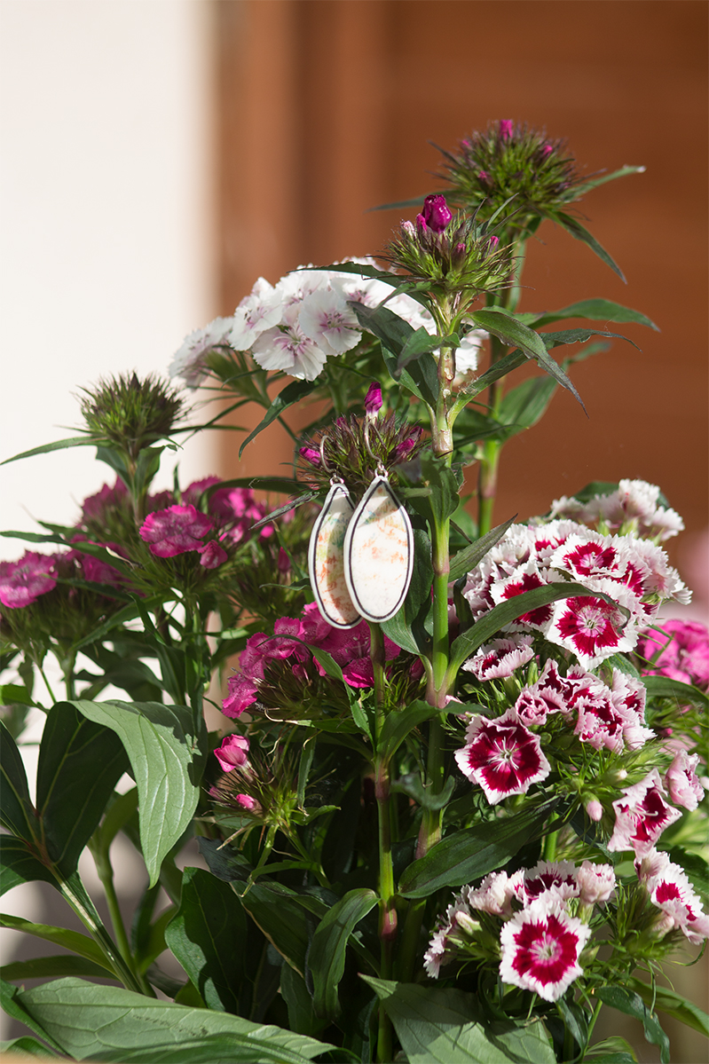 Pandemic lockdown in Ireland has been blessed with sunny and warm weather and garden is the perfect space to showcase my work. On the grey block wall is plenty space for my sculptural work - Threadscapes. Flower beds and pots offered plenty blossoms to play around as back drop for earrings.