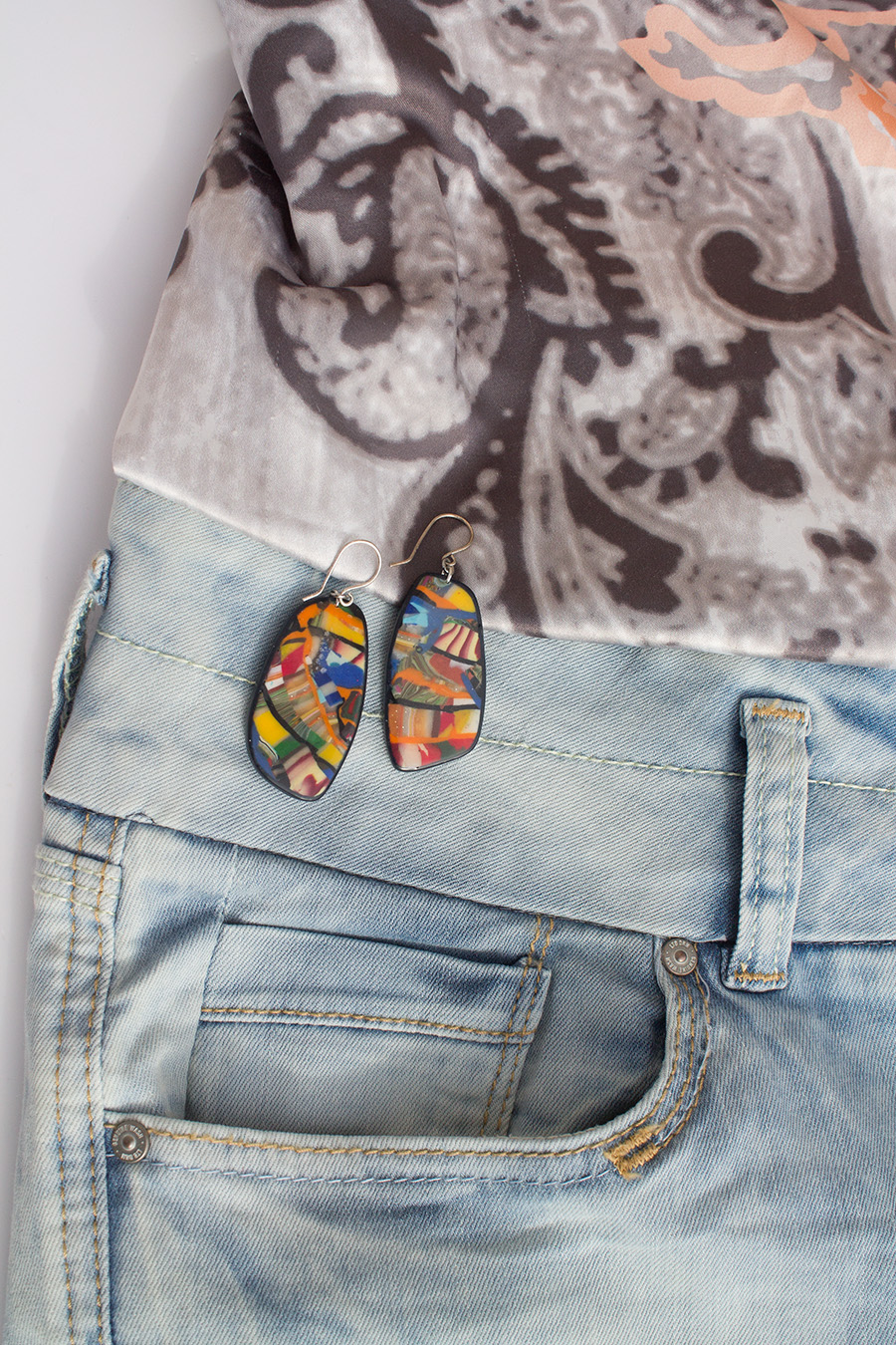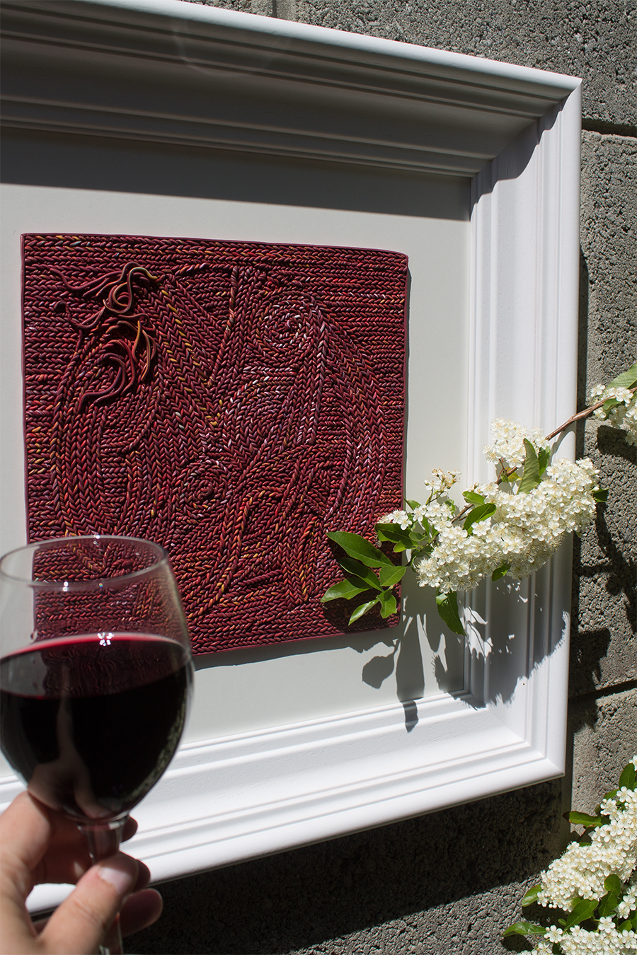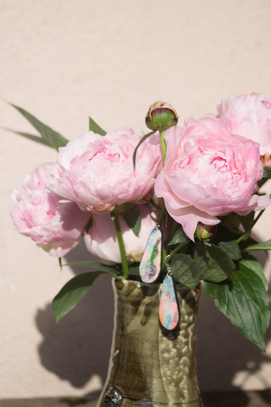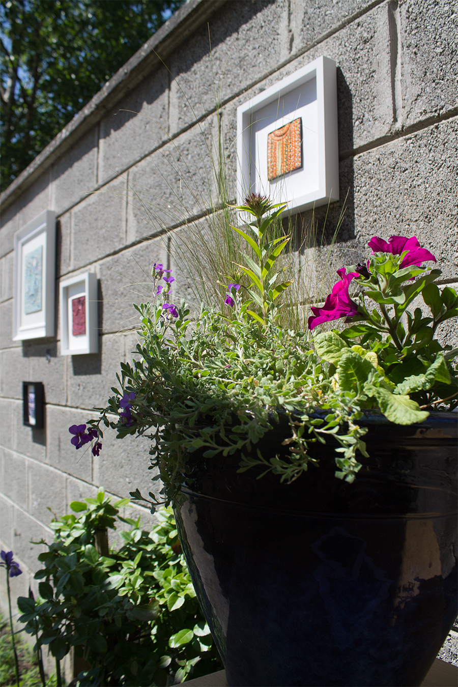 Pandemic lockdown in Ireland has been blessed with sunny and warm weather and garden is the perfect space to showcase my work. On the grey block wall is plenty space for my sculptural work - Threadscapes. Flower beds and pots offered plenty blossoms to play around as back drop for earrings.